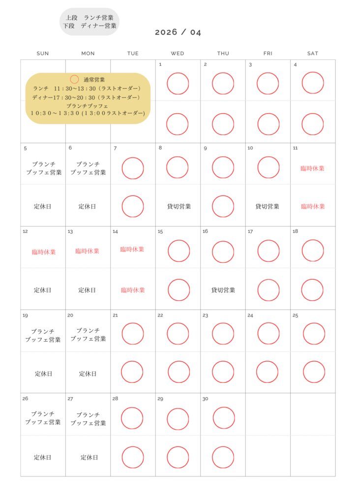 4月のランチ・ディナー営業については下記のとおり営業いたします。