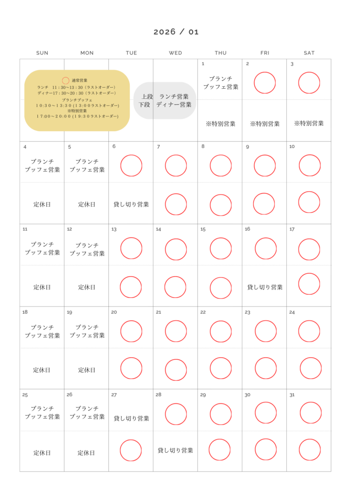 1月のランチ・ディナー営業については下記のとおり営業いたします。