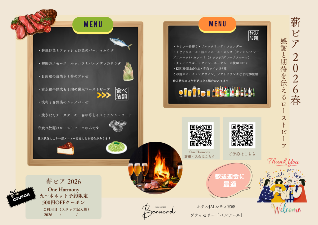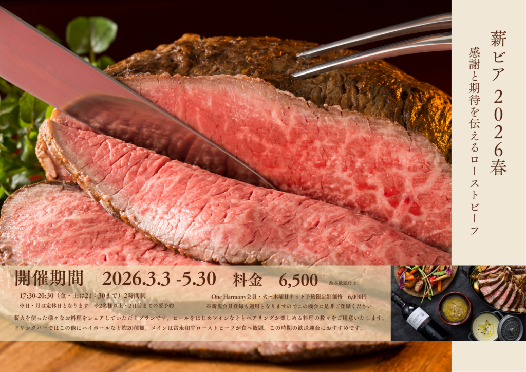 薪火を使った様々なお料理をシェアしていただくプランです。ビールをはじめワインなどとペアリングが楽しめるほか春に旬を迎える食材メニューの数々を揃えます。ドリンクバーではこの他にハイボールなど約20種類。